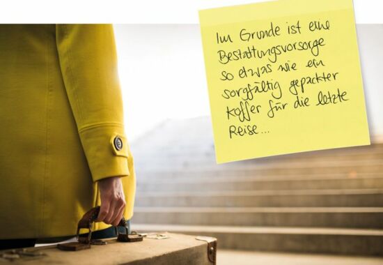 Im Grunde ist eine Bestattungsvorsorge so etwas wie ein sorgfältig gepackter Koffer für die letzte Reise. Er steht sofort bereit, wenn Sie ihn brauchen und enthält alles, was Ihnen wichtig ist. Dieser Koffer wird in Form eines Vorsorgevertrages bei Ihrem Bestatter abgeschlossen. Bei einem ausführlichen, unverbindlichen Beratungsgespräch hält der Bestatter all Ihre Vorstellungen rund um den Abschied in Ihrem Vorsorgevertrag für Sie fest. Das kann weit über die Festlegung einer Erd- oder Feuerbestattung hinausgehen. Jedes kleine Detail, das Sie sich für Ihre letzte Reise wünschen, kann im Vorfeld bestimmt werden.